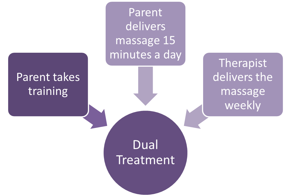 Dual treatment is recommended for children with severe autism. The QST therapist and parent partner to provide the massage to the child. Parents learn to deliver the massage and do so daily for 15 minutes (see Parent Training). The therapist sees the child once or twice a week and provides the “therapist” version of the massage, which supplements and reinforces the parent version.